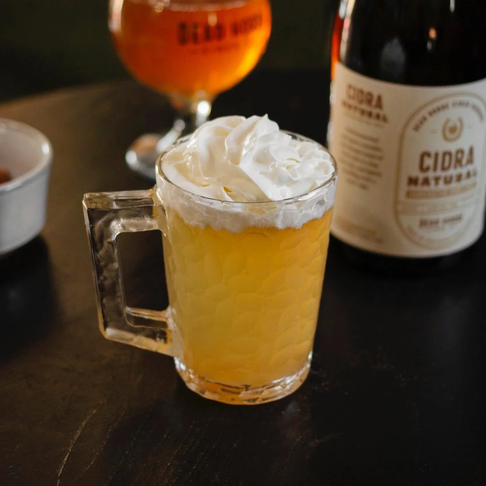 Shake the spiced rum, butterscotch schnapps, lemon juice, and a small pinch of sea salt with ice until lightly chilled. Strain it into a glass filled with fresh ice, then top it with Bright Cider and give it a gentle stir. Finish with a soft layer of whipped cream and an apple slice.